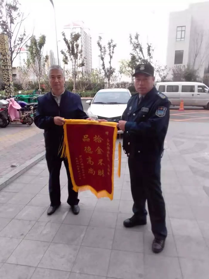 10月1日,武漢保安駐人信匯購(gòu)物中心項(xiàng)目安保員楊棕柏?fù)斓揭徊啃率謾C(jī),經(jīng)多方努力,終于聯(lián)系上失主歸還手機(jī)。為表示感謝,失主將一面寫(xiě)有“拾金不昧 品德高尚”的錦旗贈(zèng)送給楊棕柏。 業(yè)主激動(dòng)地說(shuō):“有武漢保員,我就是放心。”